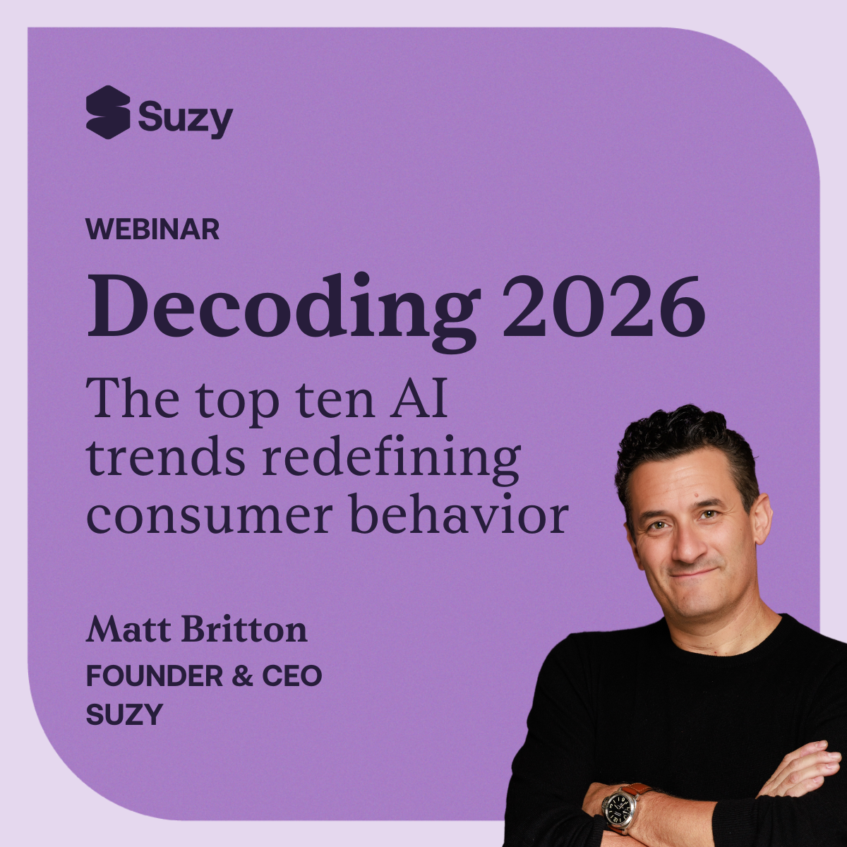 AI isn’t just changing technology — it’s reshaping how consumers discover, choose, and spend. Unpack the AI-driven shifts redefining consumer behavior in 2026 with exclusive insights from Suzy Founder & CEO Matt Britton in his must-watch webinar, Decoding 2026: The top consumer AI trends.