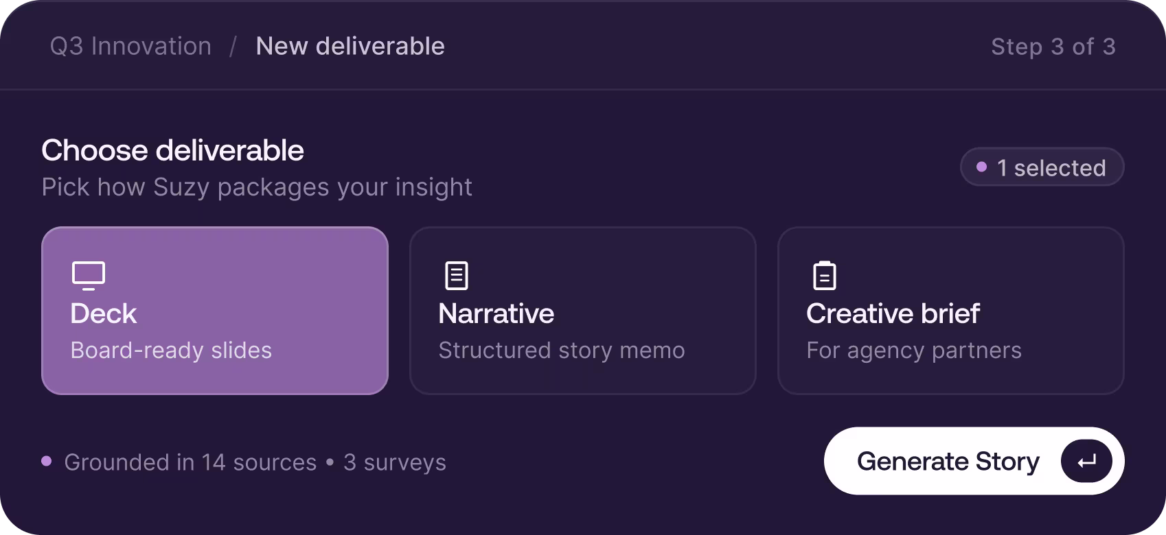 With one click, Stories transform your research into presentation-ready assets. Bold visuals, clear takeaways, and next steps – all delivered in your brand look. When insights are easy to understand and share, better decisions and smarter actions happen faster.
